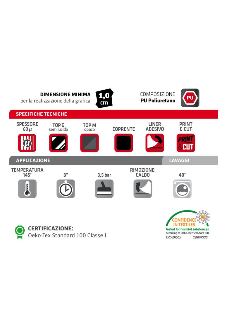 Film in poliuretano 60 mic molto sottile e morbido oltre che tecnico ed elastico. Si trasferisce in soli 8 secondi. Adatto ai tessuti difficili.