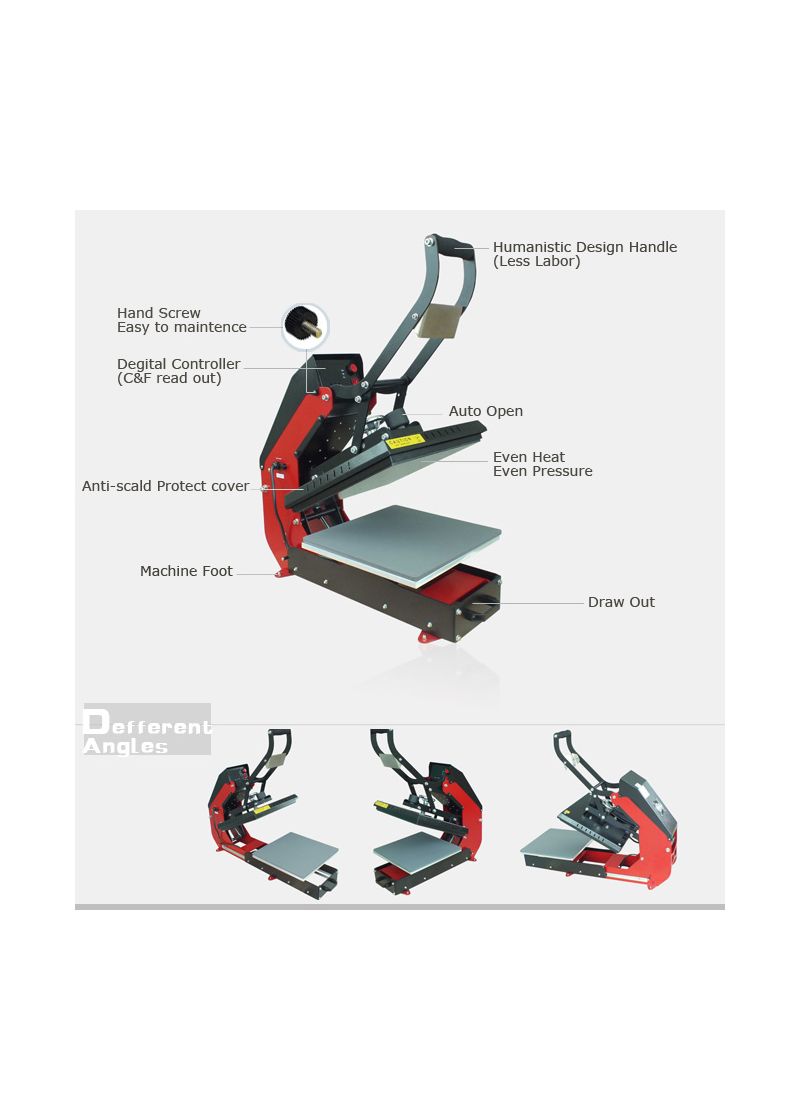 PRESSA SEMIAUTOMATICA ELETTROMAGNETICA, AD ALTA PRESSIONE. Piatto estraibile per caricare più comodamente il capo d' abbilgiamento da personalizzare. Il pian o superiore scaldato si apre a scadenza del timer impostato.